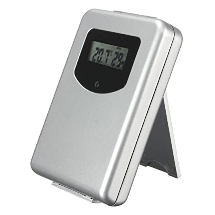 💫تصویر یک ایستگاه هواشناسی بیسیم با نمایشگر دیجیتال را نشان میدهد که دما و رطوبت را اندازهگیری میکند.