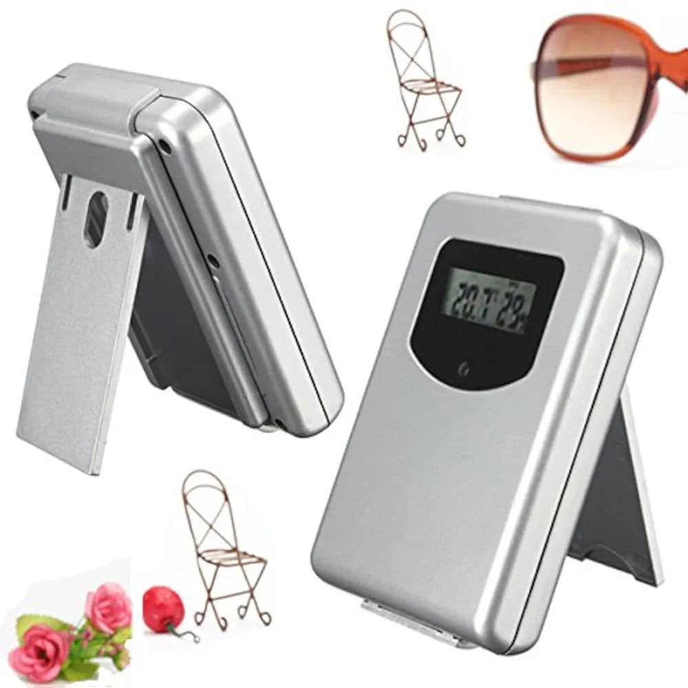 💫تصویر یک ایستگاه هواشناسی بیسیم با نمایشگر دیجیتال را نشان میدهد که دما و رطوبت را اندازهگیری میکند.