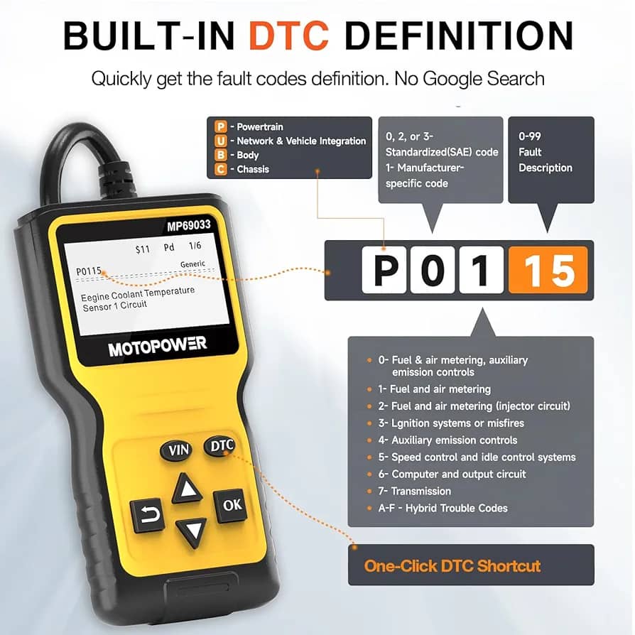 اسکنر عیبیاب خودرو MOTOPOWER MP69033 OBD2 که در تصویر مشاهده میکنید، در آمازون نیز موجود است.