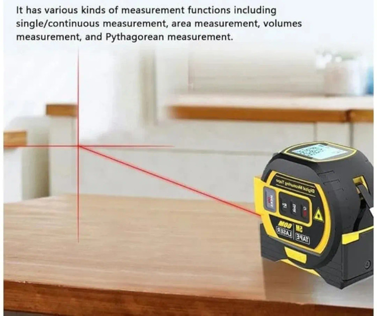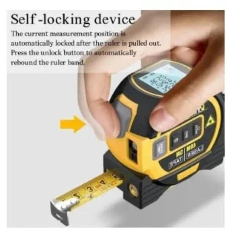 ابزار متر لیزری جدید 2023، با نمایشگر LCD، فاصله یاب لیزری 3 در 1، خط کش عمودی. این دستگاه دارای یک صفحه نمایش LCD برای نمایش اندازهگیریها است. میتواند فواصل را تا 40 متر با لیزر و تا 5 متر با متر نواری اندازهگیری کند.