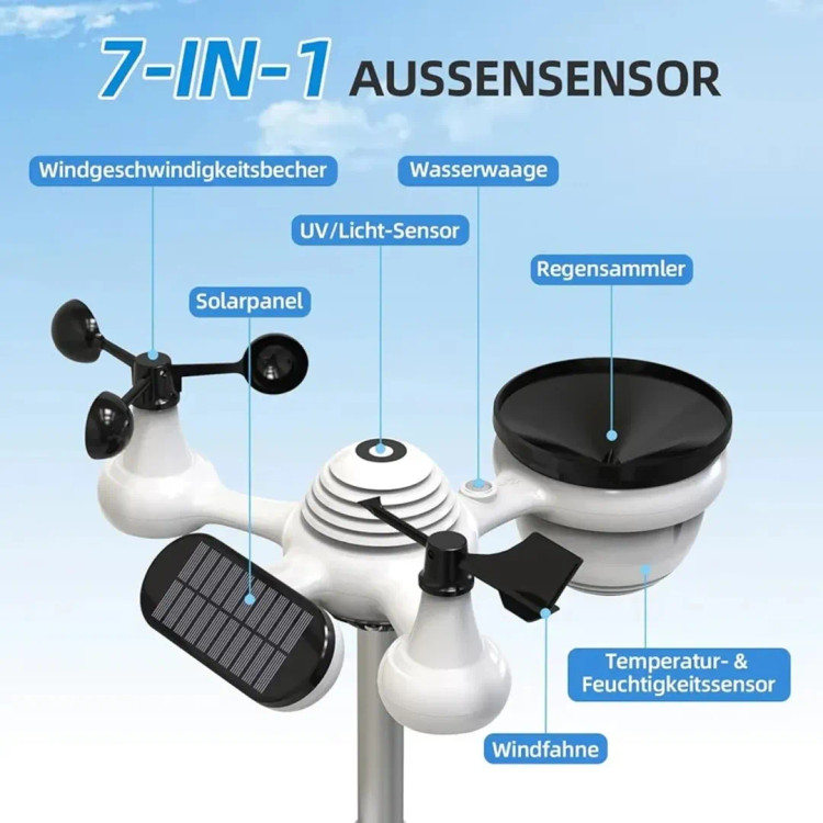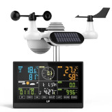 ایستگاه هواشناسی بیسیم با ساعت کنترل رادیویی DCF، بارانسنج، بادسنج، شاخص UV، پیشبینی آب و هوا و فاز ماه. این سنسور فضای باز ۷ کاره شامل بادنما، بادسنج، سنسور دما/رطوبت، جمعکننده باران، سنسور UV و نور خورشید است. هشدار آب و هوا و صفحه نمایش با روشنایی قابل تنظیم.