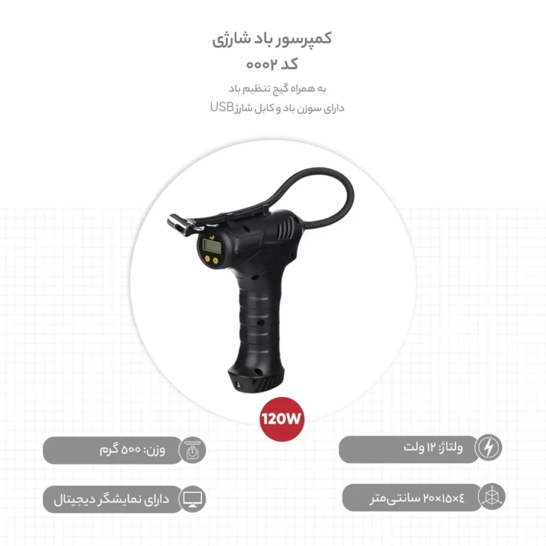 یک وسیله همانند جارو برقی است و هوای فشرده تولید می کند و برای نظافت خودرو مورد استفاده قرار می گیرد. دارای دو سری مختلف است و برای شارژ کردن آن می توانید به جا فندکی ماشین متصل شوید. این دستگاه می تواند لاستیک دوچرخه، موتور، خودرو، مبل و تشک بادی، انواع توپ و ... را باد کنید. به اندازه گیری بلادرنگ فشار باد مجهز است و از تورم بیش از حد لاستیک جلوگیری می کند. دارای شلنگ و مانومتر می باشد و به راحتی و آسانی قابل استفاده است.