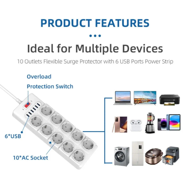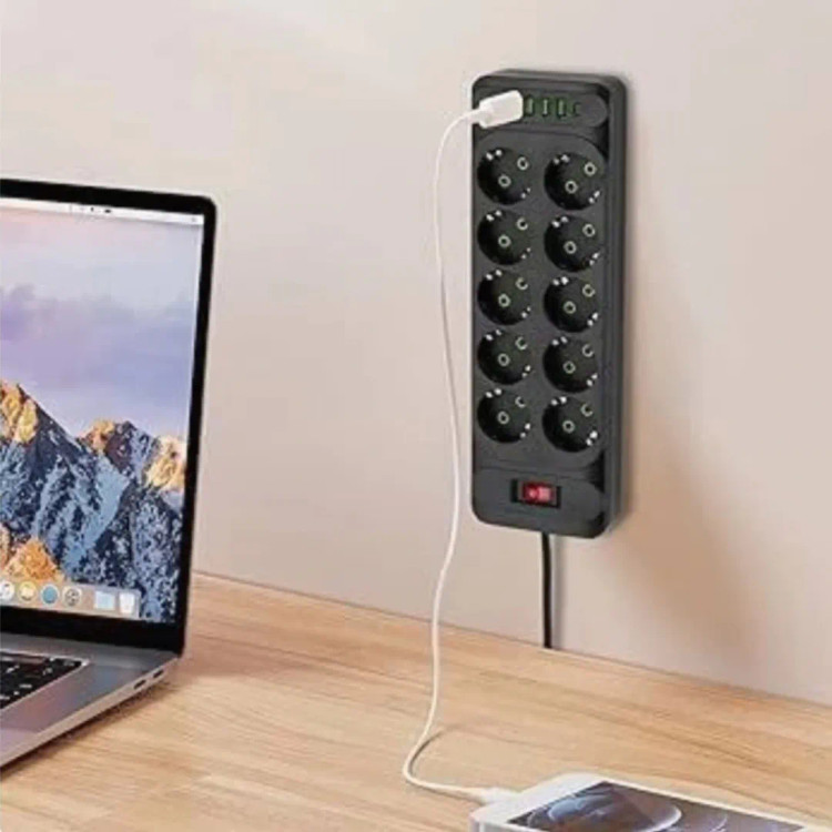 معرفی محصول، چندراهی برق 10 پریز IECOPOWER چندراهی برق USB، محافظ ولتاژ با 4 پورت USB، /16 آمپر، 1050 ژول، چندراهی برق با کلید، 10 پریز با کابل افزایش طول، 1.5 متر، مشکی این یک چندراهی برق (محافظ برق) با قابلیت شارژ USB است که ویژگیهای زیر را دارد: تعداد پریزها: دارای ۱۰ پریز برق از نوع استاندارد اروپایی (Schuko) است که امکان اتصال چندین دستگاه را فراهم میکند. پورتهای USB: چهار پورت USB برای شارژ دستگاههای الکترونیکی مانند گوشی موبایل، تبلت و پاوربانک دارد. کلید روشن/خاموش: یک کلید قرمز رنگ برای روشن و خاموش کردن کلی دستگاه و قطع جریان برق وجود دارد. محافظت از نوسانات برق: این دستگاه احتمالاً دارای محافظ داخلی برای جلوگیری از آسیب دیدن وسایل برقی در برابر نوسانات ولتاژ است.