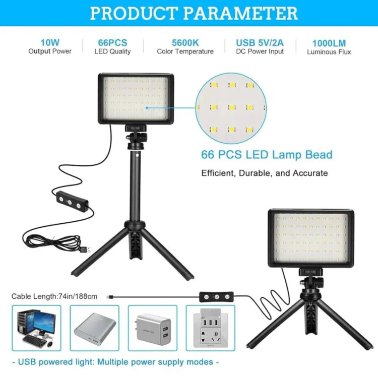 معرفی محصول،چراغ LED این چراغ ویدیویی LED برای استفاده به عنوان چراغ رومیزی در عکاسی استودیویی، عکاسی با زاویه دید کم، ضبط ویدیوی یوتیوب TikTok، پخش بازی، ارائه جلوههای نوری مختلف برای سناریوهای خاص و ضبط نمایش محصولات استودیویی مناسب است. کیت نور ویدیویی LED USB شامل: ( پنل نور LED USB با کابل USB، ( سه پایه کوچک، ( فیلتر سفید، ( فیلتر زرد، ( فیلتر آبی، ( فیلتر قرمز سهپایه کوچک تاشو: این سهپایه کوچک سبک و تاشو است، حمل و نگهداری آن آسان است؛ با ارتفاع کاری ثابت (۳.۹ اینچ)، سهپایه کوچک را میتوان مستقیماً به پنل نور متصل کرد تا نورپردازی بسیار کمنور تضمین شود. همچنین میتوان آن را به میلهی افزایش طول دو تکه، که ۹.۸ تا ۱۳.۴ اینچ ارتفاع دارد، برای نورپردازی رومیزی متصل کرد. کیت پنل نور LED قابل تنظیم: پنل نور LED کوچک را میتوان ۱۸۰ درجه تنظیم کرد تا نیازهای مختلف شما را برای زاویه عکاسی مناسب برآورده کند؛ روشنایی نور LED USB را میتوان از ۱۰٪ تا ۱۰۰٪ تنظیم کرد؛ چهار فیلتر رنگی (قرمز، آبی، زرد، سفید) تجربیات بصری متفاوتی را ارائه میدهند. رابط کابل USB راحت: چراغ LED را با شارژر دیواری USB (5 ولت 2 آمپر) یا کابل USB روشن نگه دارید. میتوانید برای استفاده طولانیتر آن را به پریز برق یا دوشاخه USB خود وصل کنید، یا برای استفاده موقت آن را به منبع تغذیه کامپیوتر رومیزی یا موبایل خود وصل کنید.
