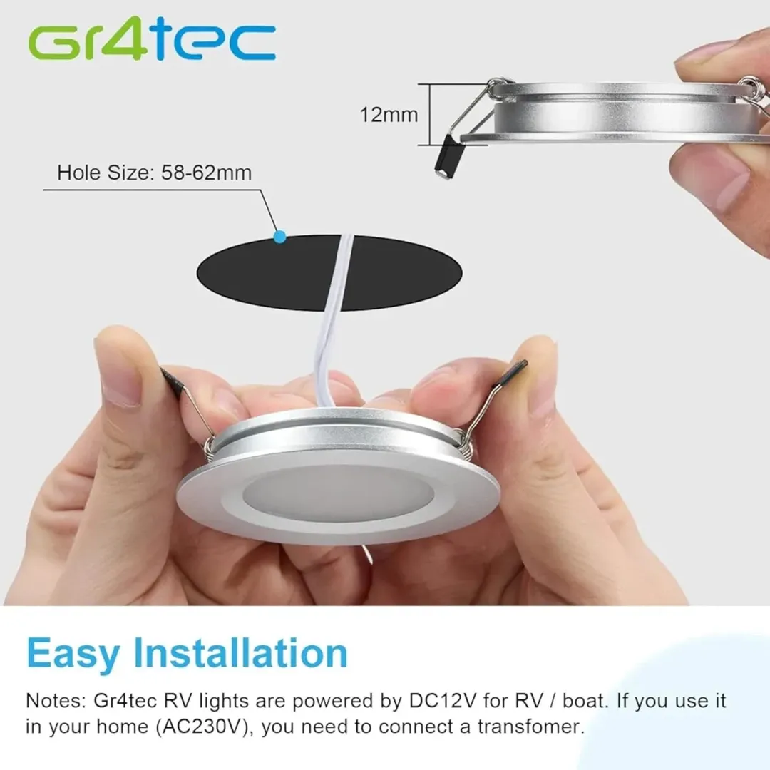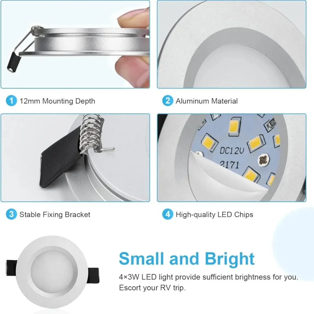 چراغ سقفی LED 3 وات با قابلیت تنظیم نور، روشنایی بسیار بالا و طراحی IP44. بدنه نازک ۱۲ میلیمتری و دیافراگم فوق عریض 120 درجه برای توزیع یکنواخت نور، مناسب برای استفاده در حمام، آشپزخانه، و قایقها.