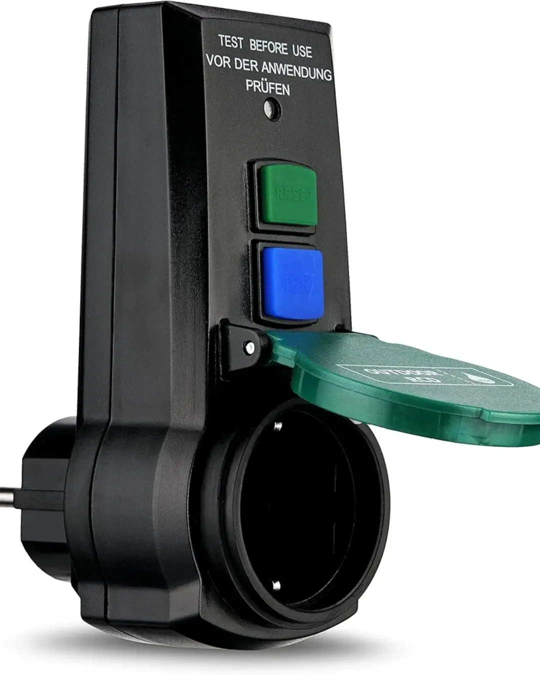 آداپتور حفاظت جریان باقیمانده دوشاخهی محافظ اتصال با عملکرد حفاظت فردی، ضد پاشش آب، حفاظت IP 44 در برابر شوکهای الکتریکی خطرناک. با زمان قطع کمتر از 30 میلیثانیه و جریان باقیمانده نامی 30 میلیآمپر. عملکرد محافظت در برابر آب فضای باز.