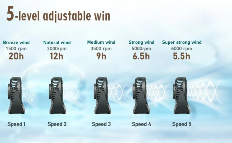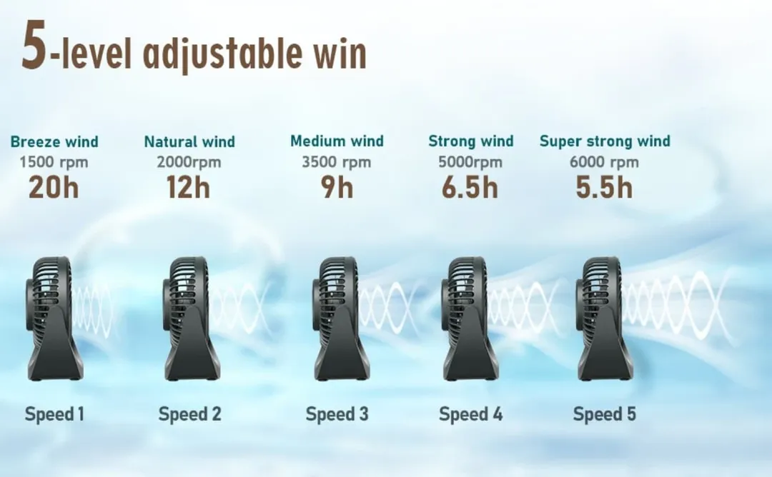 پنکه رومیزی USB با موتور بدون جاروبک از جنس مس خالص، بادهای قوی ایجاد میکند و در عین حال عمر مینی پنکه را افزایش میدهد. این پنکه با ۵ سرعت میتواند نیازهای مختلف شما را برآورده کند و دارای عملکرد کمسرعت نرم و آرامشبخش است.