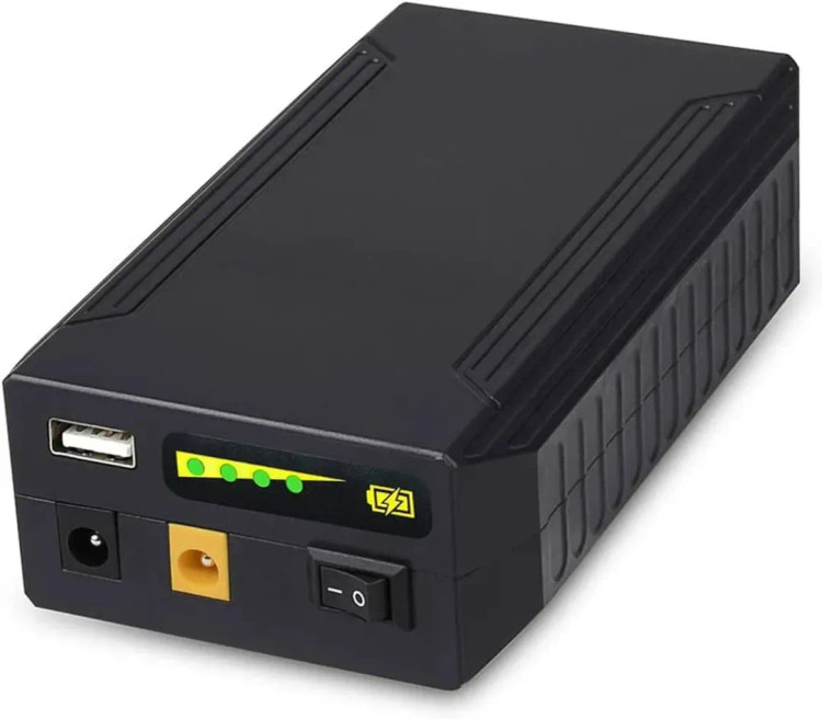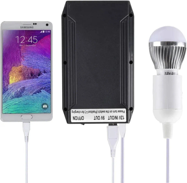 پاوربانک قابل حمل با خروجیهای چندگانه DC 12/9 ولت و 5 ولت USB مناسب برای نوار چراغ LED، دوربین مداربسته و موبایل. بسته شامل شارژر دیواری و کابل تقسیم برق DC است.