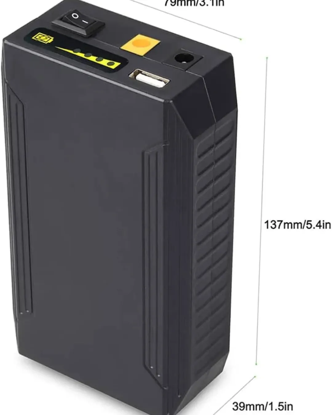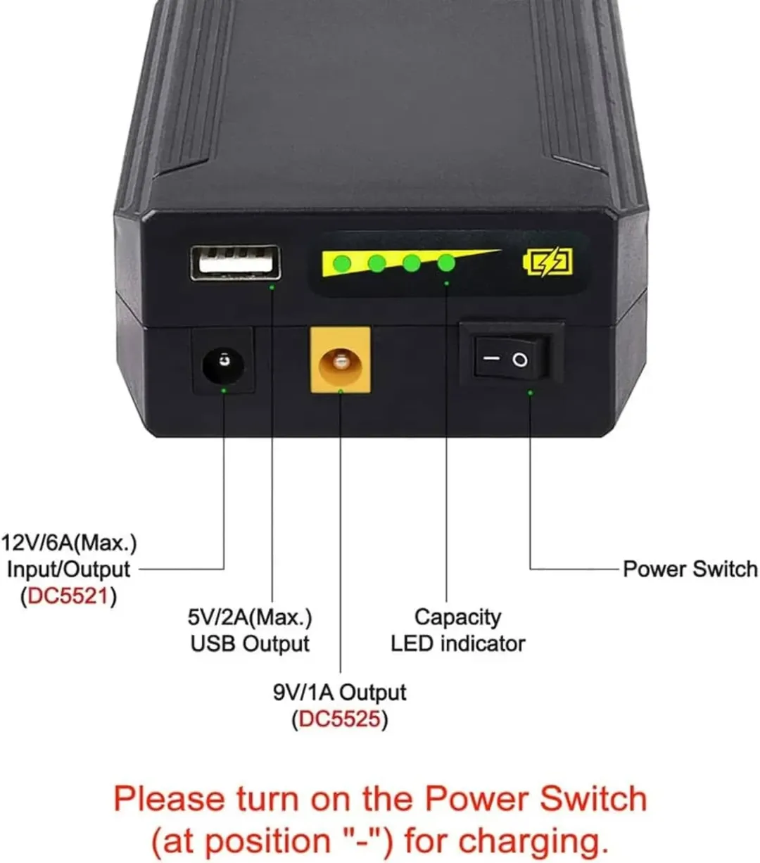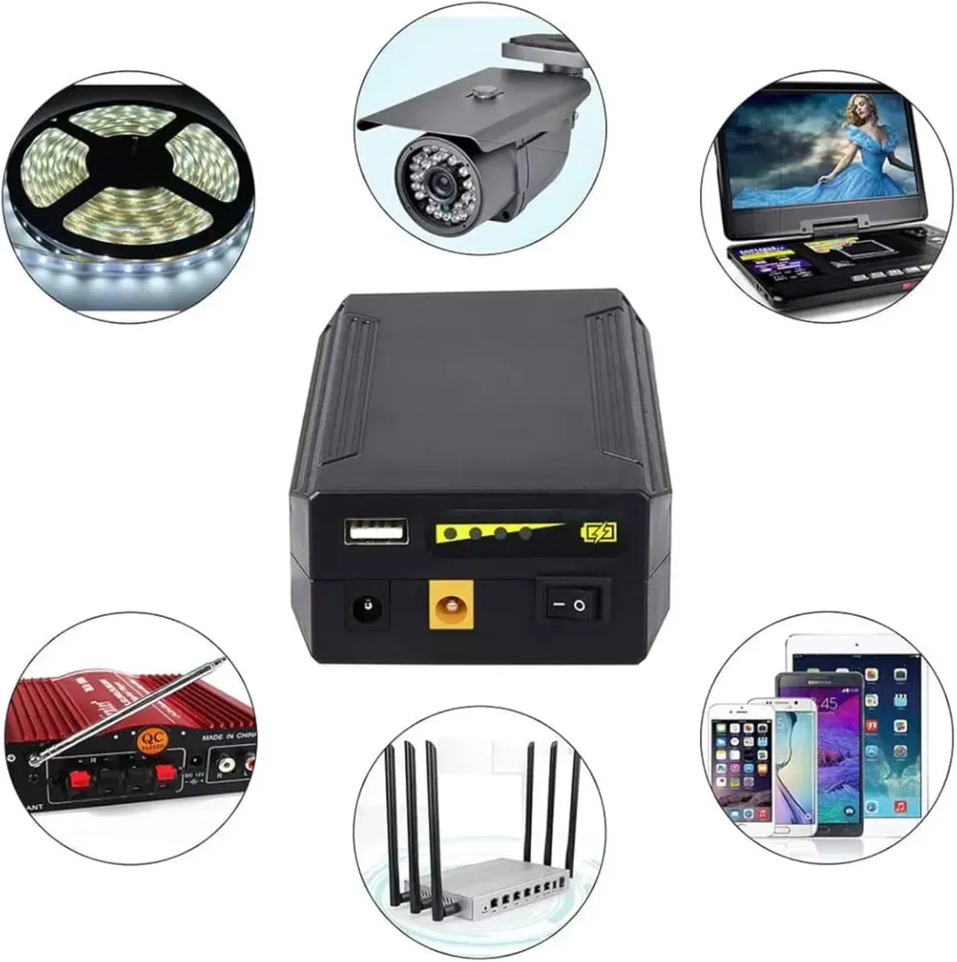 پاوربانک قابل حمل با خروجیهای چندگانه DC 12/9 ولت و 5 ولت USB مناسب برای نوار چراغ LED، دوربین مداربسته و موبایل. بسته شامل شارژر دیواری و کابل تقسیم برق DC است.