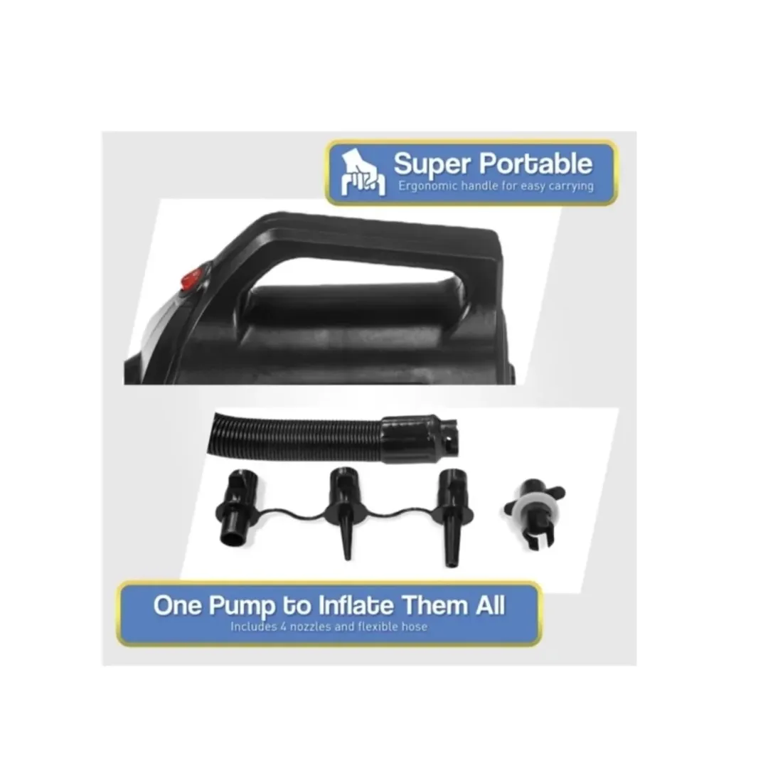 این پمپ باد الکتریکی برای باد کردن مسیرهای هوایی، تشک های ژیمناستیک، تخت های بادی و سایر وسایل بادی مناسب است. با سرعت بالا باد بزرگترین بادیها را در عرض چند دقیقه تجربه خواهید کرد. پمپ دارای ۴ اتصالات مختلف و دارای درگاه مکش برای تخلیه باد میباشد.