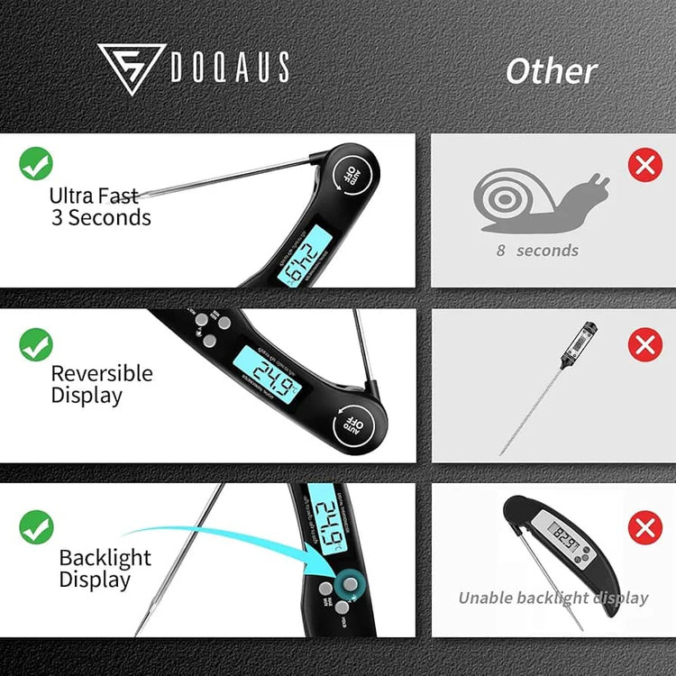 فوق العاده سریع و دقیق ۳ ثانیهای: دماسنج فوری DOQAUS، دما را در عرض ۳ ثانیه به طور دقیق اندازهگیری میکند! دماسنج غذا با دقت ۱- درجه و طیف وسیعی از دماهای -۵۸ تا ۵۷۲ درجه فارنهایت / -۵۰ تا ۳۰۰ درجه سانتیگراد. دماسنج گوشت دیجیتال ما تقریباً برای همه مناسبتهای آشپزی به شما خدمت میکند: استیک، کباب، مربا یا آبجوی یخی، از گرمای شدید تا سرمای انجماد. دستورالعملهای دما روی بستهبندی به شما کمک میکند تا به پختگی دلخواه غذای خود برسید.