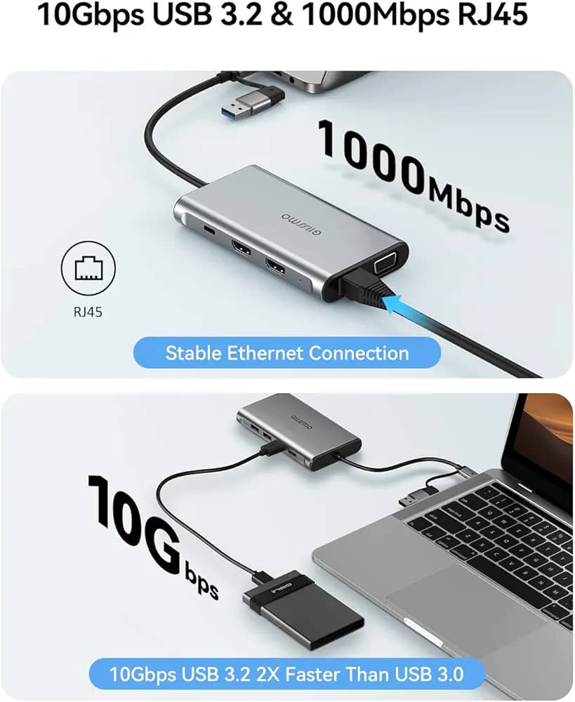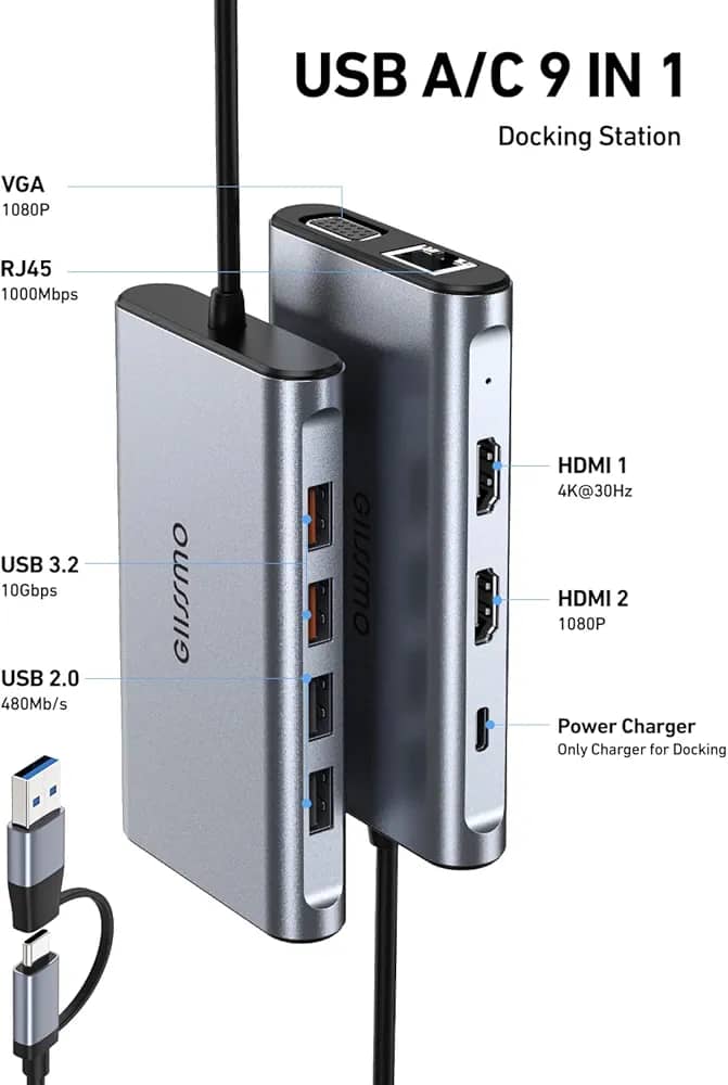 داک مانیتور دوگانه GIISSMO، داک 9 کاره USB A 3.0 / USB C با 2 پورت HDMI، VGA، USB 3.1 با سرعت 10 گیگابیت بر ثانیه، اترنت گیگابیت، نمایشگر سهگانه برای مک، مکبوک و ...