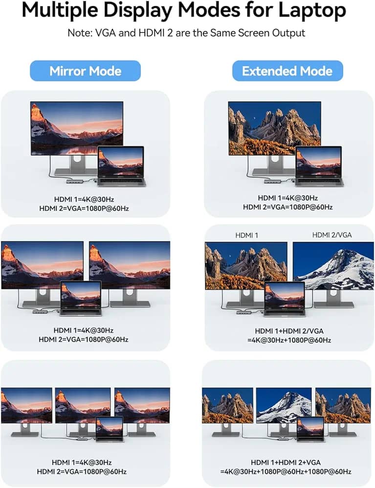 【ایستگاه اتصال دو مانیتور/سه مانیتور】: این ایستگاه اتصال USB به دو HDMI + VGA به شما کمک میکند تا صفحه نمایش لپتاپ خود را به سه یا دو مانیتور خارجی متصل کنید. نمایشگر سهگانه: یک نمایشگر از لپتاپ شما، یک نمایشگر با خروجی HDMI1 و یک نمایشگر HDMI2 یا VGA. توجه: پورت HDMI2 با کیفیت 4K@30Hz فقط به صورت جداگانه برای لپتاپهای DP1.4 کار میکند.