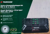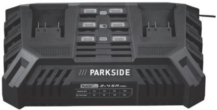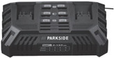 💫 تصویر یک شارژر دوقلوی باتری با برند پارکساید (PARKSIDE) را نشان میدهد که اطلاعات مربوط به آن به شرح زیر است: