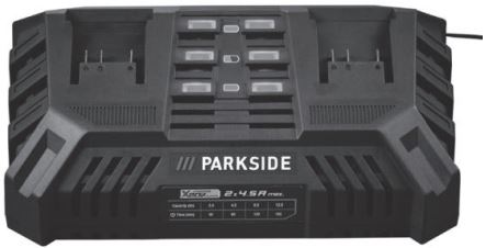 💫 تصویر یک شارژر دوقلوی باتری با برند پارکساید (PARKSIDE) را نشان میدهد که اطلاعات مربوط به آن به شرح زیر است: